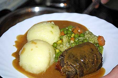 "Thüringer Klöße mit Honiggemüse und Rinderroulade"