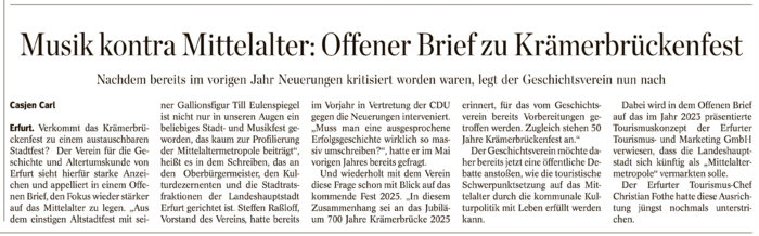 2023 präsentierte die Erfurter Tourismus- und Marketing GmbH ein neues Tourismuskonzept. Die Landeshauptstadt solle sich künftig als „Mittelaltermetropole“ vermarkten, wie jüngst ETMG-Chef Christian Fothe nochmals unterstrich. Seit vielen Jahren hatten Fachleute und Geschichtsfreunde für diese Fokussierung auf die „historische DNA“ unserer Stadt plädiert. Nicht zuletzt hatte sich der Erfurter Geschichtsverein hierfür eingesetzt, wobei der Begriff Mittelaltermetropole vom Unterzeichnenden in den Diskurs eingebracht wurde.