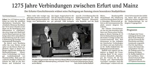 Steffen Raßloff: Erfurt und Mainz. Eine deutsch-deutsche Städtepartnerschaft mit langer Vorgeschichte. In: Mitteilungen des Vereins für die Geschichte und Altertumskunde von Erfurt 78 (2017). S. 121-157.